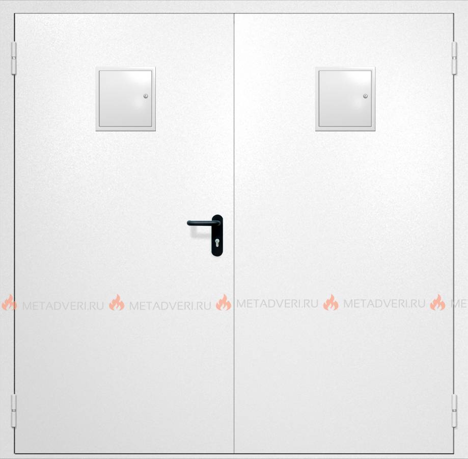 Двупольная противопожарная дверь EI-60 с двумя стыковочными узлами сверху, окрас по RAL 9003, артикул 1836 от «Фабрики стальных дверей» защищает от пожара, а также распространения токсичных продуктов горения. Дверь прошла независимые испытания в в лаборатории и имеет сертификат, подтверждающий предел огнестойкости EI-60. Время сохранения защитных свойств равняется одному часу.