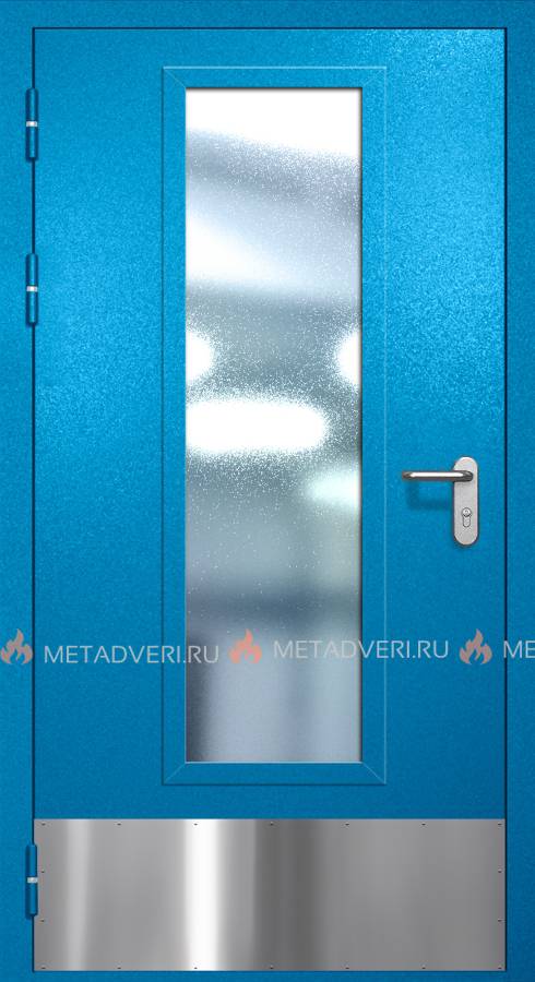 Однопольная противопожарная дверь EIW-60 с максимальным стеклопакетом, отбойником и ручкой «Антипаника», окрас по RAL 5002, артикул 1392 от «Фабрики стальных дверей» обеспечивает надежную защиту от пожара, а также распространения дыма. Дверь прошла тесты в условиях открытого горения и имеет сертификат, подтверждающий предел огнестойкости EI-60. Время эффективной защиты равняется одному часу.