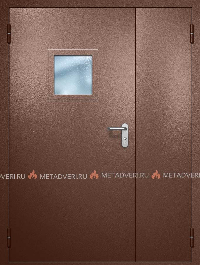 Полуторная противопожарная дверь EI-60 с квадратным стеклопакетом и ручкой «Антипаника», окрас по RAL 8016