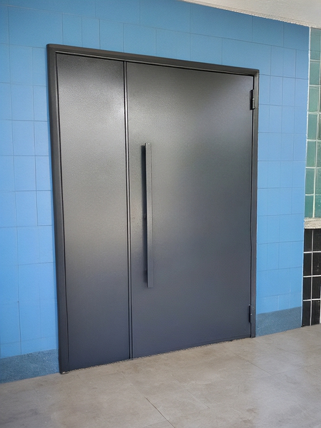Двупольная техническая дверь с ручкой-скобой и кодовым замком, окрас по RAL 8016