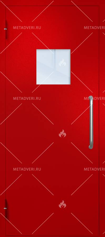 Однопольная техническая дверь с ручкой-скобой и квадратным стеклопакетом, окрас по RAL 3003, арт. 1916 от «Фабрики стальных дверей» устанавливается для мест служебного пользования. Дверь имеет необходимые сертификаты и сопровождается гарантийным обслуживанием.